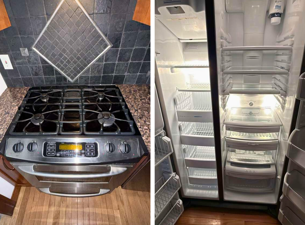 In the kitchen, the stove was deep cleaned, including burners, grates, and exterior surfaces, removing grease and buildup. The refrigerator was fully cleaned inside, with shelves and drawers washed and sanitized
